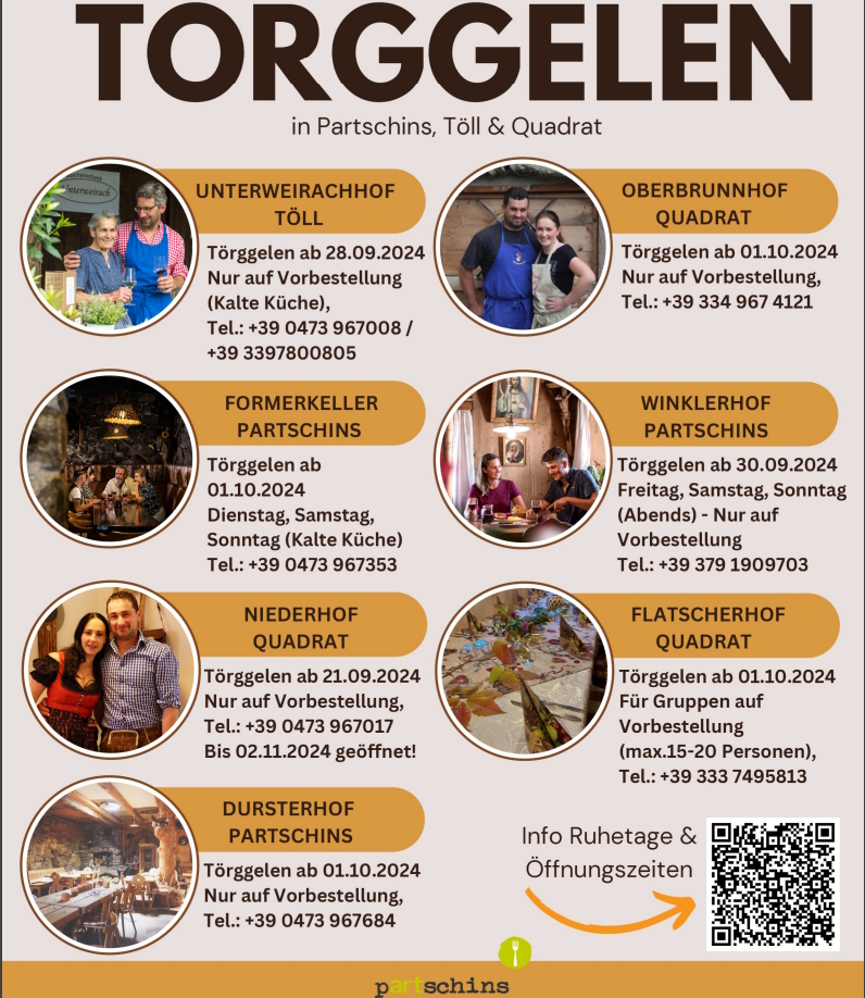 Kein Herbst ohne Törggelen, dem beliebten Südtiroler Brauch.Typisch für die Mahlzeit in urigen Kellern und Buschenschänken sind Gerstsuppe (Graupensuppe), Schlachtplatte mit Würsten, Selchfleisch, Kraut und Knödel.